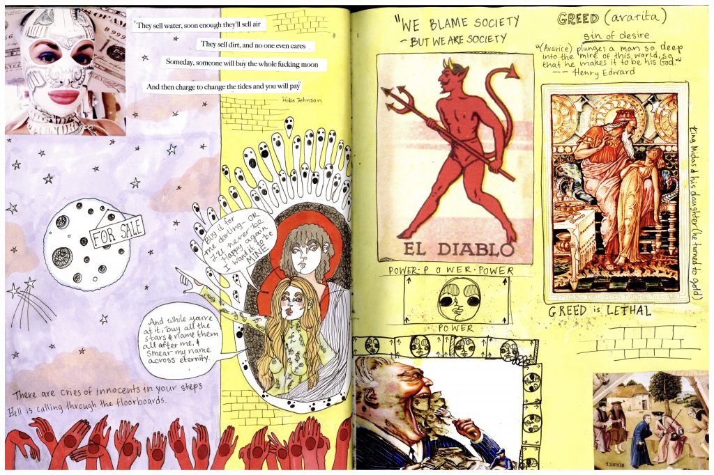 The Kal Yuga scarf collection tells the modern-day story of Dante’s Inferno and the Seven Deadly sins. It is a contemporary exploration of the visual symbolism of 21st-century sin  “a Bomb That Looks Like Candy in that it connects with the inner child to engage the awareness of the viewer about environmental and social issues of our times.”