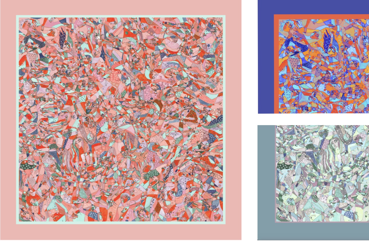 Fate’s Cuddle Puddle scarves were designed during the first lockdown while she was thinking about culture and desire from a quantum perspective and they are a symbolic portrait of the interconnected nature of reality. Inspired by Robert Sheldrake and his theories of morphic resonance, as well as the theories of Nassim Haramein; two scientists whose work deeply impacted Fate as a teenager. Whilst looking at advertising and cultural trends in the context of Sheldrake's findings, Fate “saw the ways which we all react to each other, how one person’s desire becomes another’s, and how contagious we are as a species. I saw 7 Billion yearning souls with their 7 Billion Schemes, all connected together... the good, the bad, and the ugly... each perspective influencing the others, whether aware of it or not... and with that, I saw the whole of creation... the fractal nature of reality... the lucid mirage... there is self, there is no other, and we are all connected.”